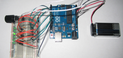 6 LEDs sind über einen 330Ohm Vorwiderstand an die Digitalausgänge 7-12 angeschlossen. Das Poti ist an Analogeingang 1 angeschlossen.
